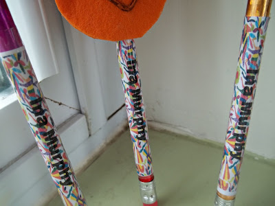 She also wanted to give the children pencils with their names on them. She found that special ordering just a few of each child's name would be quite expensive, so she bought some clear plastic labels and made them herself on her computer. I think she may have used white labels for these and printed animals and birds in the background. They are a little hard to see, but it did add some color and the children loved having their very own pencils.